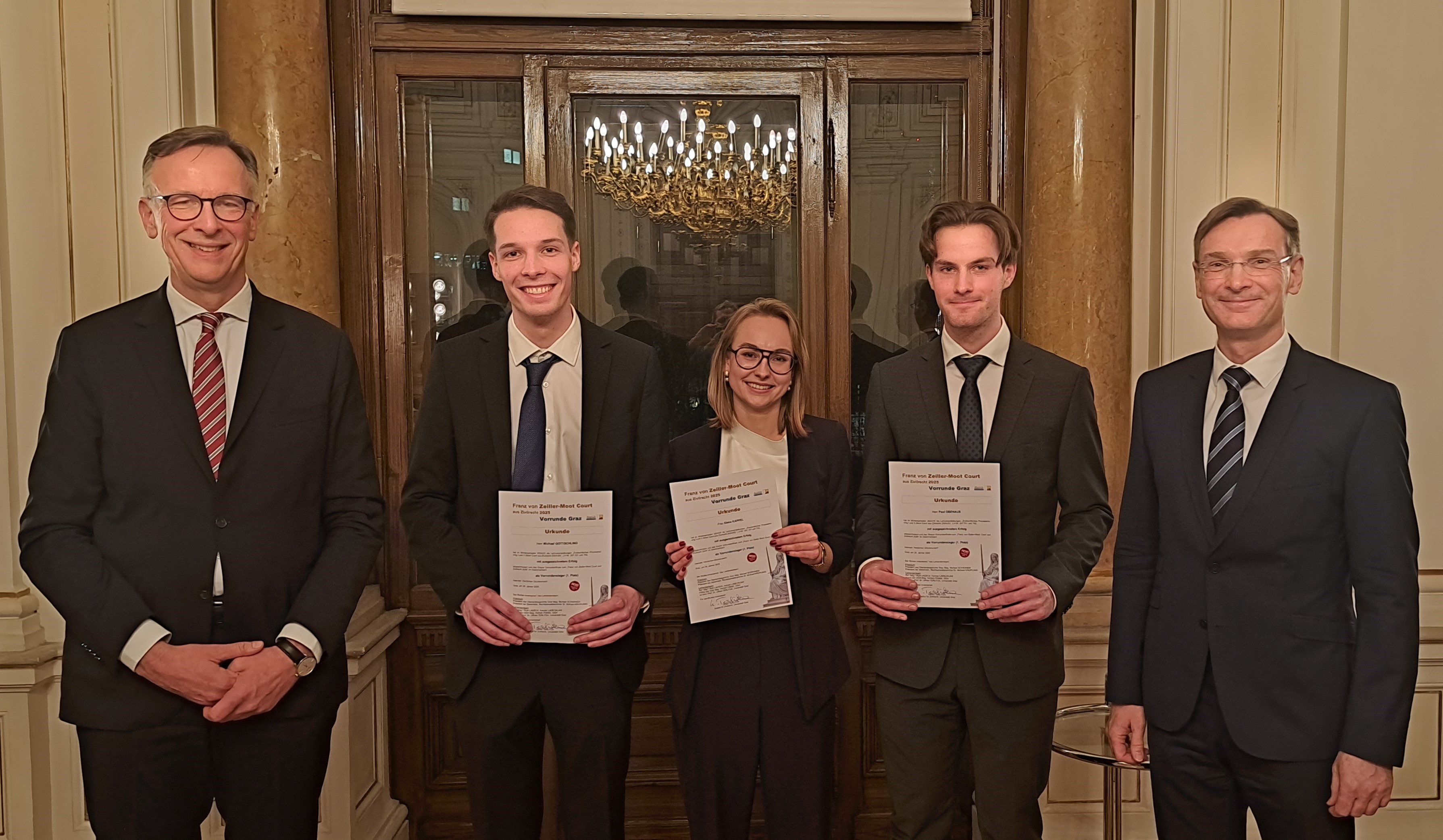 Das Grazer Moot Court-Team mit Elena Kappel, Michael Gottschling und Paul Obenaus, auf anwaltlicher Seite hervorragend betreut von RA Mag. Lukas Andrieu, LL.M. BSc, und RAA Mag. Christian Eder, beide ScherbaumSeebacher Rechtsanwälte GmbH, hat im Bundesfinale des “Franz von Zeiller-Moot Court aus Zivilrecht 2025” am 6. Juni 2025 in Innsbruck eine rundum bestechende Leistung gezeigt und dafür berechtigte Glückwünsche von allen Seiten, vor allem auch von gegnerischen Teams, erhalten.